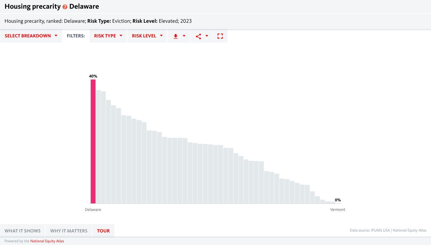Select the Geography Type as State, Ranking in the Select Breakdown menu, Eviction under Risk Type, and Elevated under Risk Level. We can see that in Delaware, 40 percent of renters (about 41,400 renter households) live in census tracts with an Elevated level of Eviction Risk. [Link to indicator page]