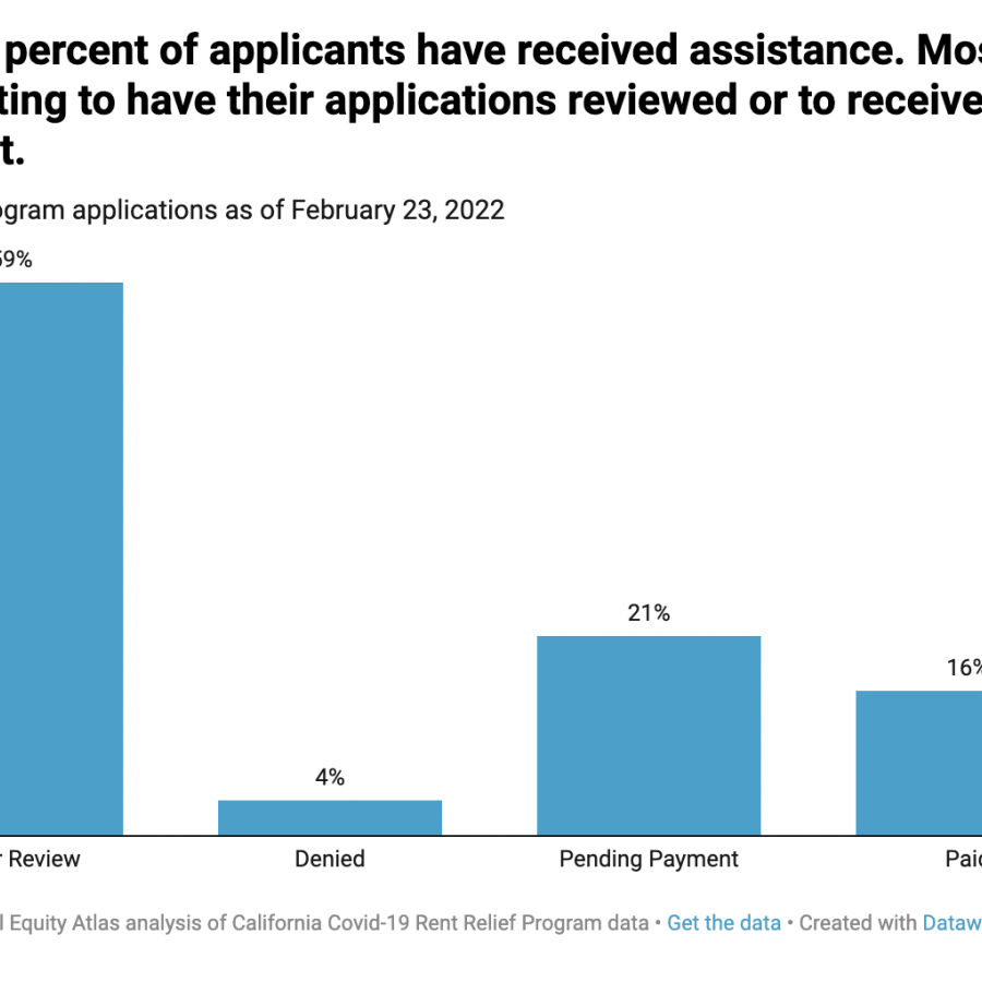 This brief, produced by the National Equity Atlas in partnership with Housing NOW! and Western Center on Law & Poverty, examines the performance of California’s statewide rental assistance program since its launch. The state program covers about 63 percent of the state’s population; the other 37 percent of California residents live in the 25 cities and counties that opted to administer their own programs. Our analysis is based on a dataset tracking all rental assistance applications submitted by renters to the program through February 23, 2022, which we obtained through a Public Records Act request. It includes anonymized individual case data with applicant demographics (race/ethnicity, income, and language of application), zip code, amount of rent and utilities requested and paid, and landlord participation in the application. It also includes detailed case status categories including “Application Complete: Pending Payment,” which is assigned to households that have been approved for payment but have not actually received funds and are still waiting for assistance.[1] We used the 2015–2019 American Community Survey Public Use Microdata Sample to summarize rent burden, racial/ethnic demographics, and primary language, and Census Household Pulse Survey Data on rent debt to compare program applicants and beneficiaries to the likely population of renters in need of assistance.