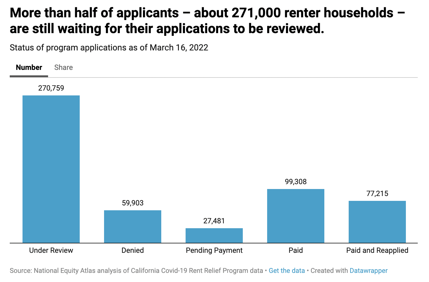- Most applicants are still waiting for assistance. More than 366,000 renter households are either waiting in line for review, have been approved and awaiting payment, or have reapplied to the program for additional support that has not yet been approved.