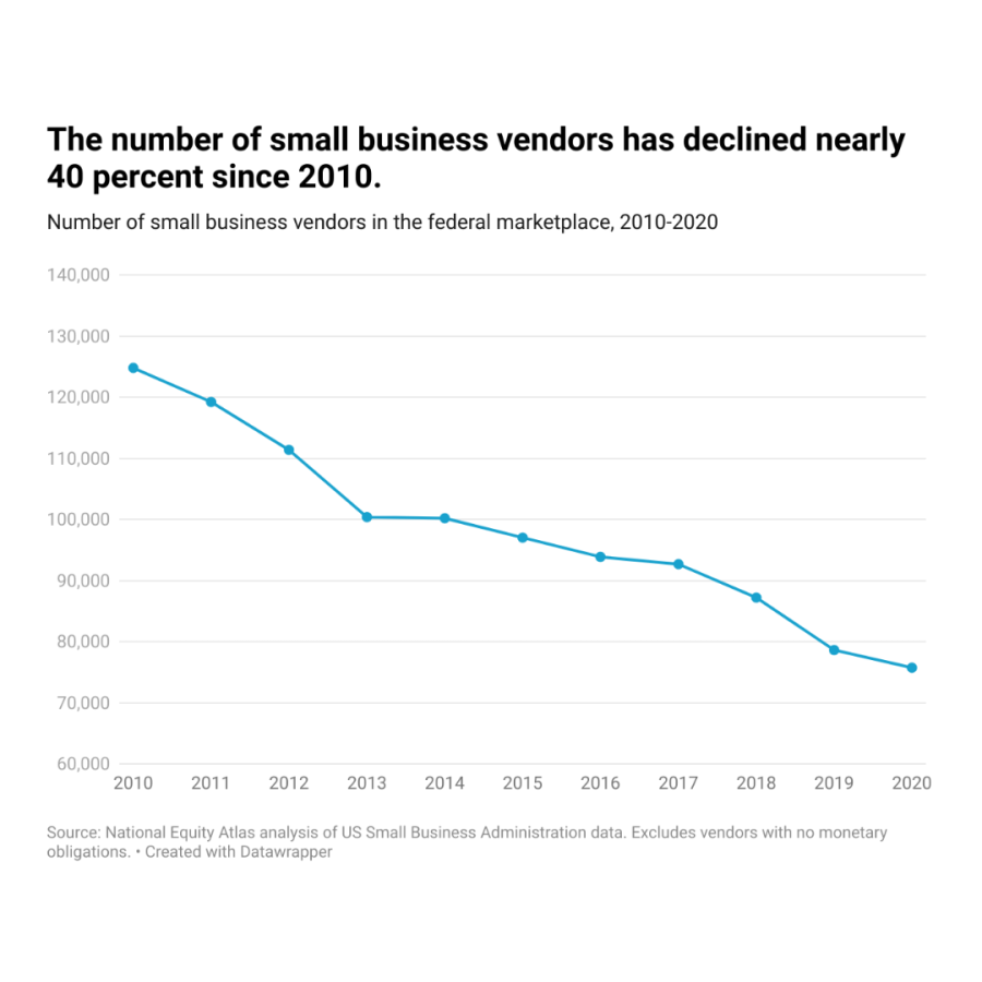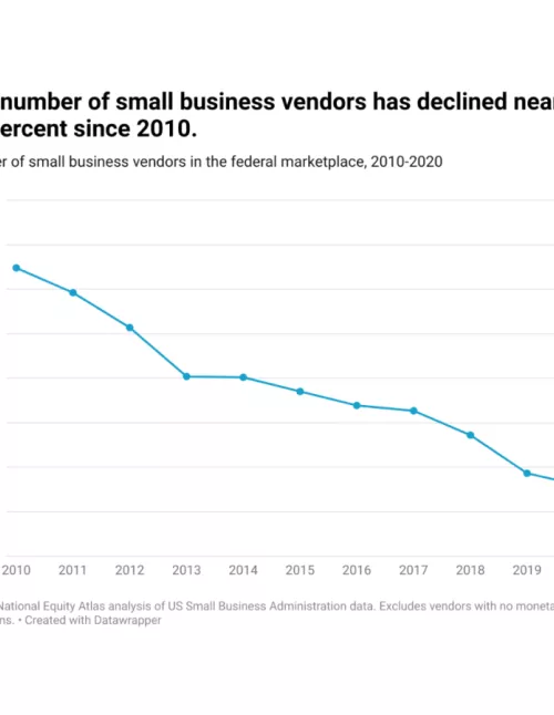 In 2010, about 125,000 small businesses contracted with the federal government. That number has shrunk year after year and by 2020, just under 76,000 small businesses fulfilled federal contracts — a 39 percent decline. Although a larger share of federal contracts are going to small businesses, fewer small businesses — and fewer communities — are benefiting from these business opportunities.