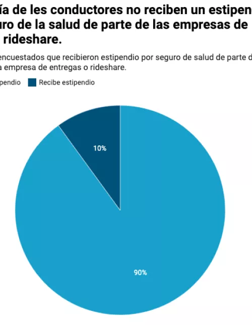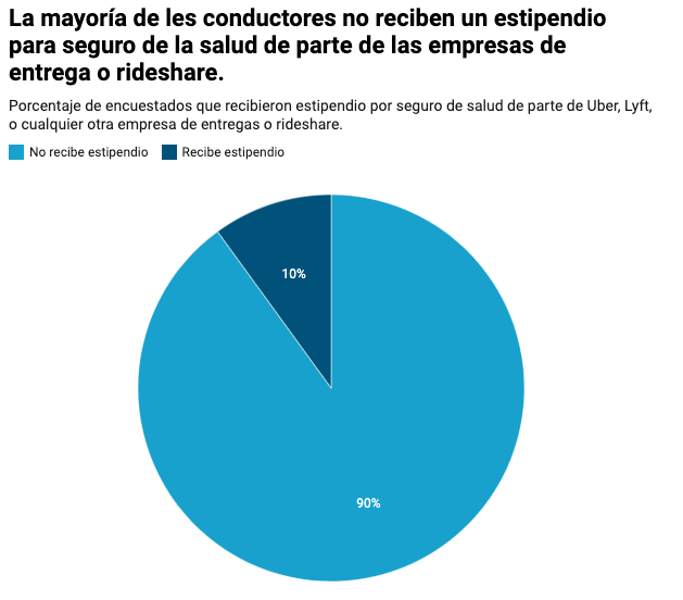 Nos enteramos de que es altamente probable que los conductores dependan del sistema público: casi un tercio de les encuestados reciben seguro de salud por medio de Medi-Cal. Este dato indica que muches conductores tienen dificultad económica, ya que Medi-Cal está reservado primordialmente para les persones que están al 138 por ciento bajo el nivel de pobreza. También nos enteramos de que la mitad de les encuestades recién seguro por medio de Medi-Cal, Medicare, o por medio del cónyuge o compañere de vida, lo cual automáticamente los descalifica para recibir estipendios para el cuidado de la salud. Por medio de estos requisitos limitados, la Propuesta 22 permite que Uber y Lyft se ahorren miles de millones en costos de seguro para la salud que tenían que pagar antes que la legislación fuera promulgada.